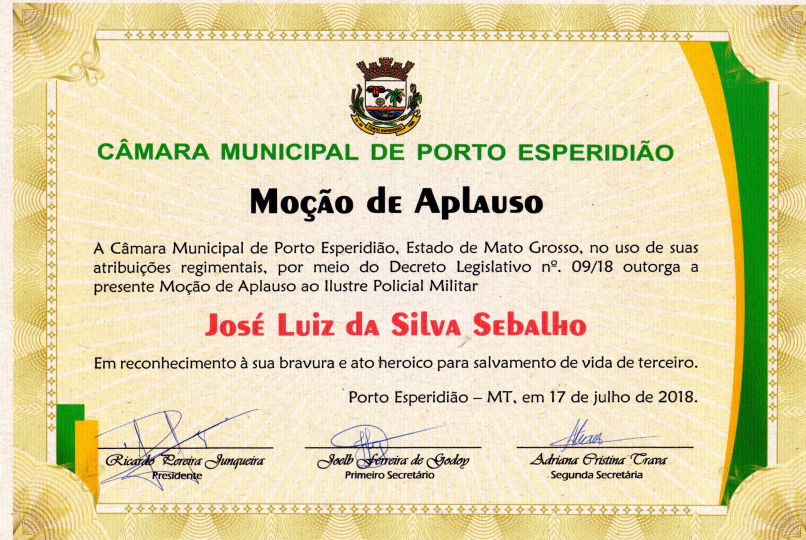 Na de ontem 17/09/2018 uma Moção de aplausos da Câmara de Vereadores de Porto Esperidião, todas em reconhecimento ao ato de bravura e esforço realizado em salvar o motorista de caminhão.