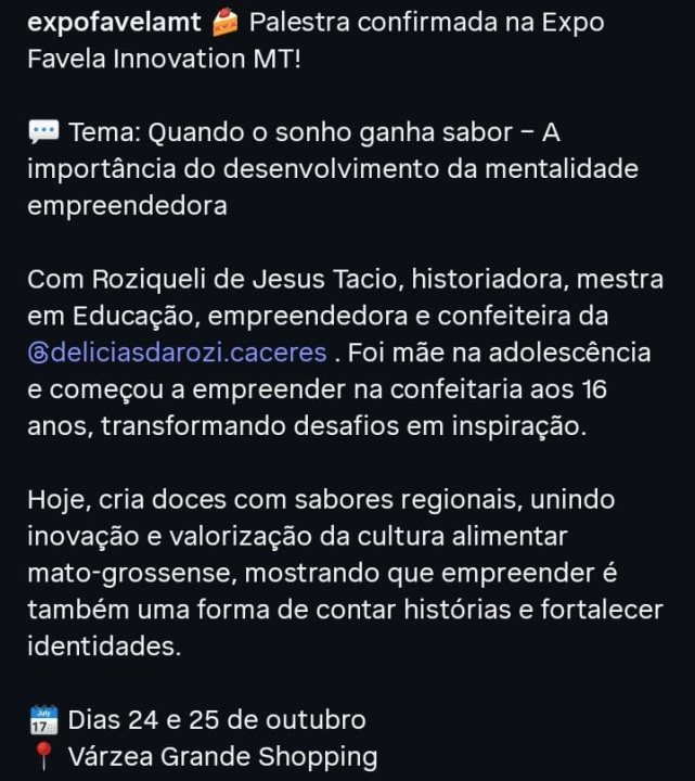 A empreendedora Roziqueli de Jesus Tacio, fundadora da marca @deliciasdarozi.caceres, será uma das palestrantes confirmadas na Expofavela Innovation Mato Grosso 2025, o maior evento do país voltado para o empreendedorismo das favelas e periferias.