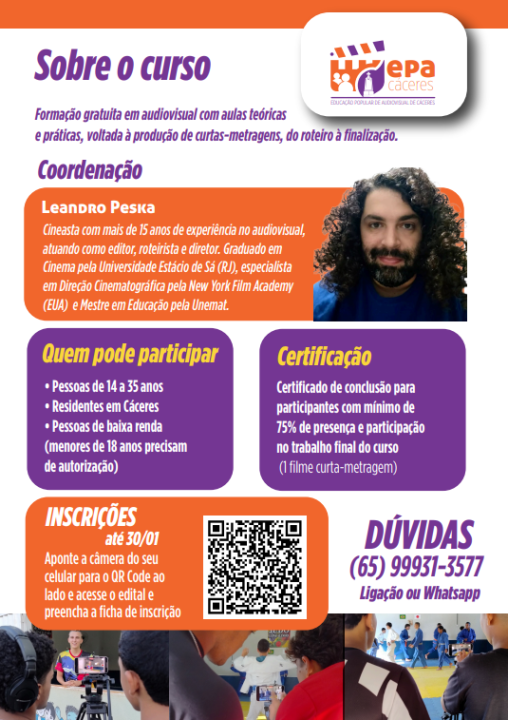 “A partir de uma metodologia chamada ‘Cinema na Palma da Mão’ que desenvolvo há alguns anos em Cáceres, os(as) participantes do projeto vão entrar em contato com os principais conceitos da linguagem cinematográfica – roteiro, fotografia, direção e produção – e a partir do smartphone vão aplicar esses conhecimentos em exercícios práticos que vão comprovar a possibilidade de se fazer cinema de qualidade no interior do Brasil com recursos limitados”, afirma Leandro Peska, cineasta que atua como proponente e educador do “EPA Cáceres”.